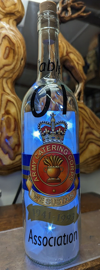 Bottles are made using locally sourced bottle (yes the local) and vary in type (you can choose from my stock), which is why I can put more designs and extras on the bottles themselves. I use the vinyl mentioned below and they come with a starry effect liner and I have upgraded to a cork effect coloured 2m rechargeable LED light string with different colours, personalised to your design preference. Bottle's are charged at £12 plus postage, please see postage costs below below.
